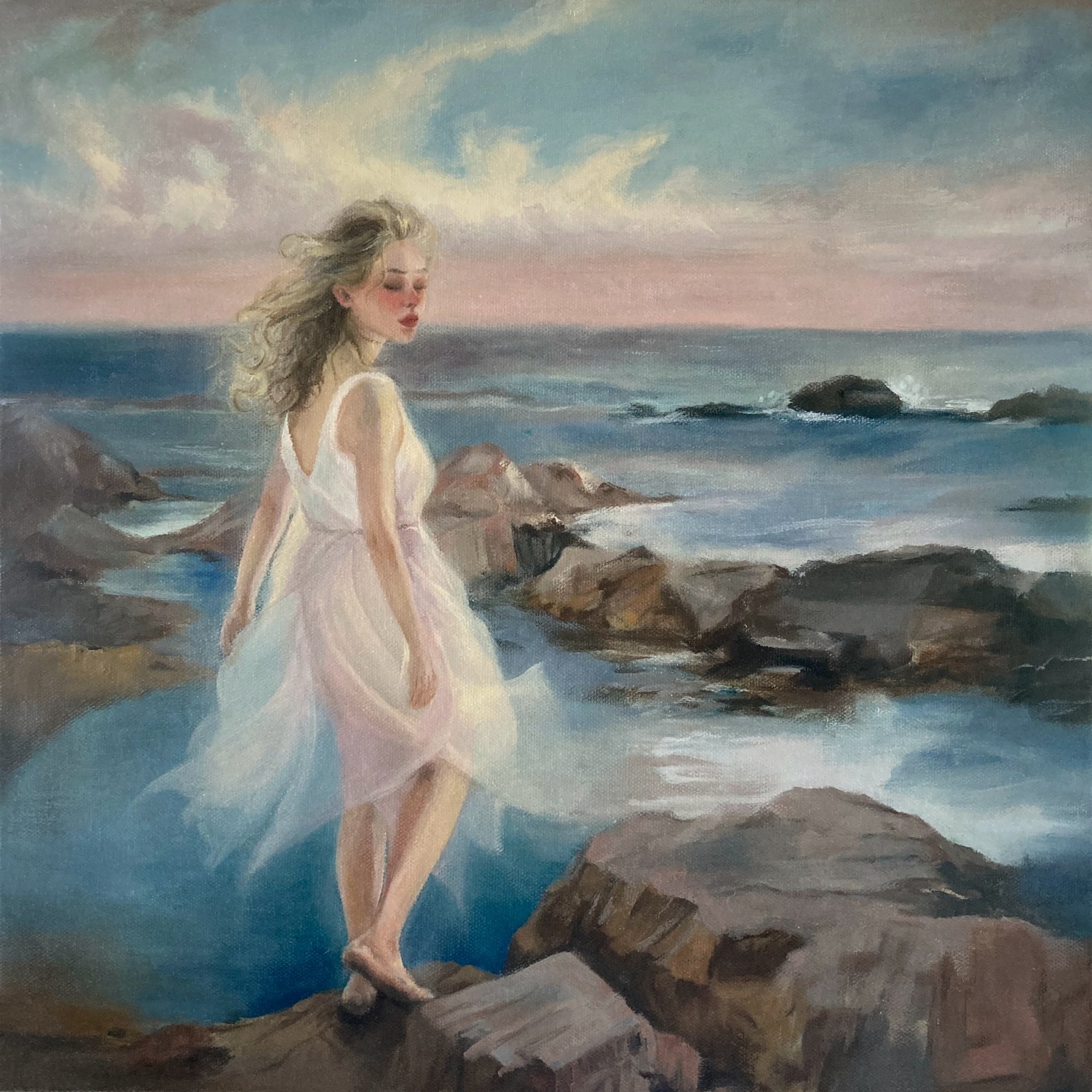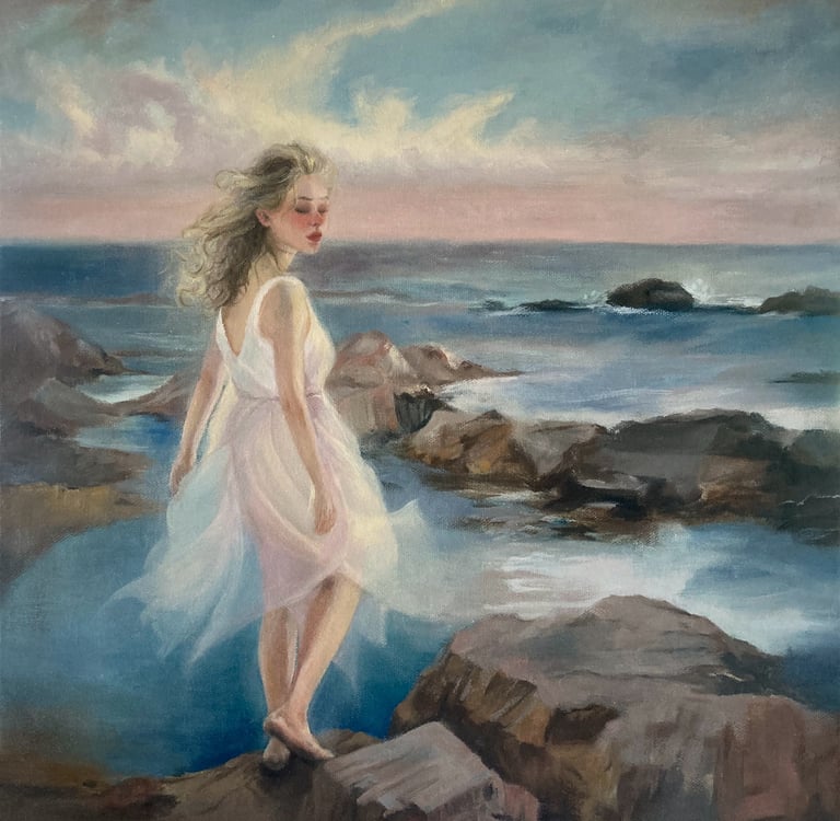 My latest oil painting feels like a memory of many poetic moments: of summers, of the sea, of the breeze that carries time itself. It’s a place in my memories that probably never truly existed, yet somehow all the moments I’ve lived have created it. I wanted this oil painting to feel like a quiet breath, a moment where memory and emotion linger.
